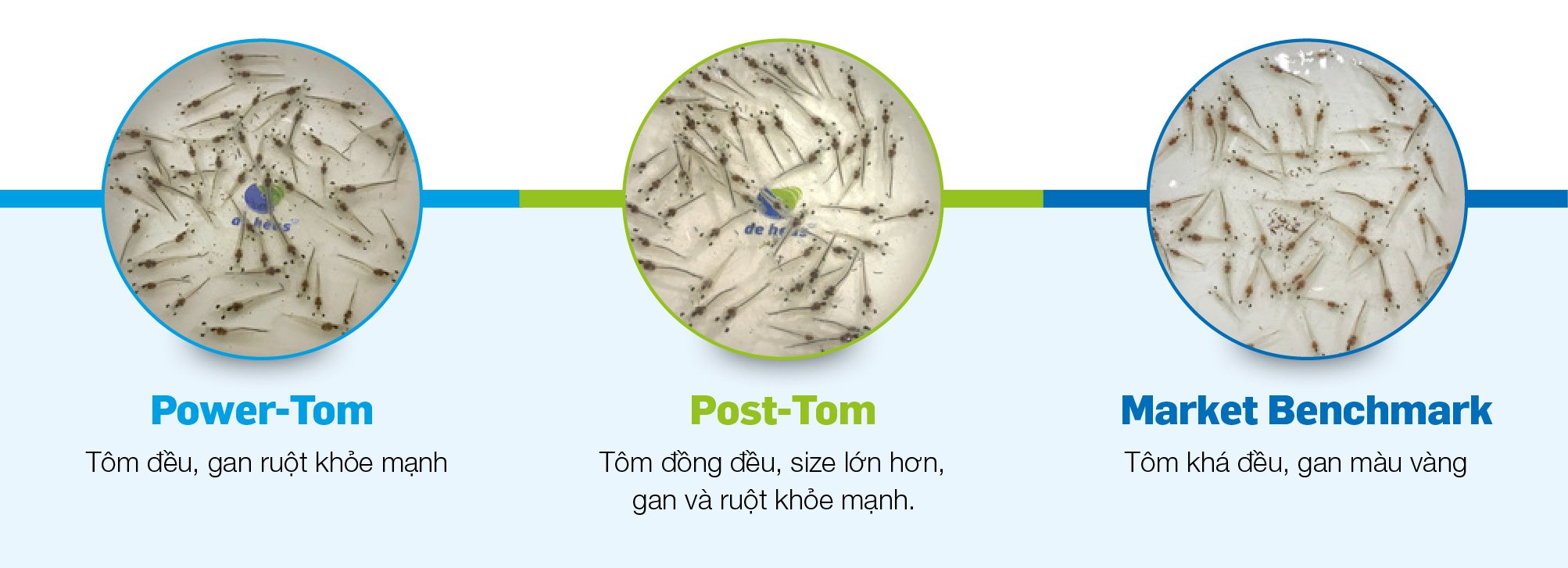 Dòng sản phẩm POST-TOM đã trải qua quá trình nuôi thử nghiệm thực tế tại Trung tâm R&D hiện đại của De Heus, và được so sánh với sản phẩm POWER-TOM (thức ăn dạng mảnh truyền thống) và một dòng thức ăn ép đùn khác trên thị trường. Kết quả sau 3 tuần nuôi thử nghiệm, thức ăn POST-TOM có tốc độ tăng trưởng nhanh, đồng đều và duy trì sức khỏe tốt thông qua các chỉ số sức khỏe gan tụy.