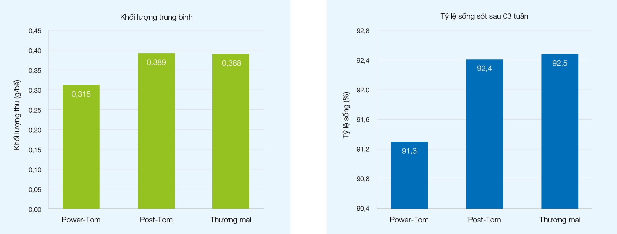 Kết quả về tăng trưởng và chỉ số sức khỏe của tôm được thể hiện trong Hình 1 (trọng lượng trung bình trên mỗi con) và Hình 2 (tỷ lệ sống sau 3 tuần cho ăn). Trong thí nghiệm này, tôm từ giai đoạn PL12 được cho ăn bằng ba loại thức ăn khác nhau: Power-TOM (thức ăn dạng mảnh của De Heus), POST-TOM (thức ăn ép đùn của De Heus) và một loại thức ăn ép đùn cao cấp đối chứng.