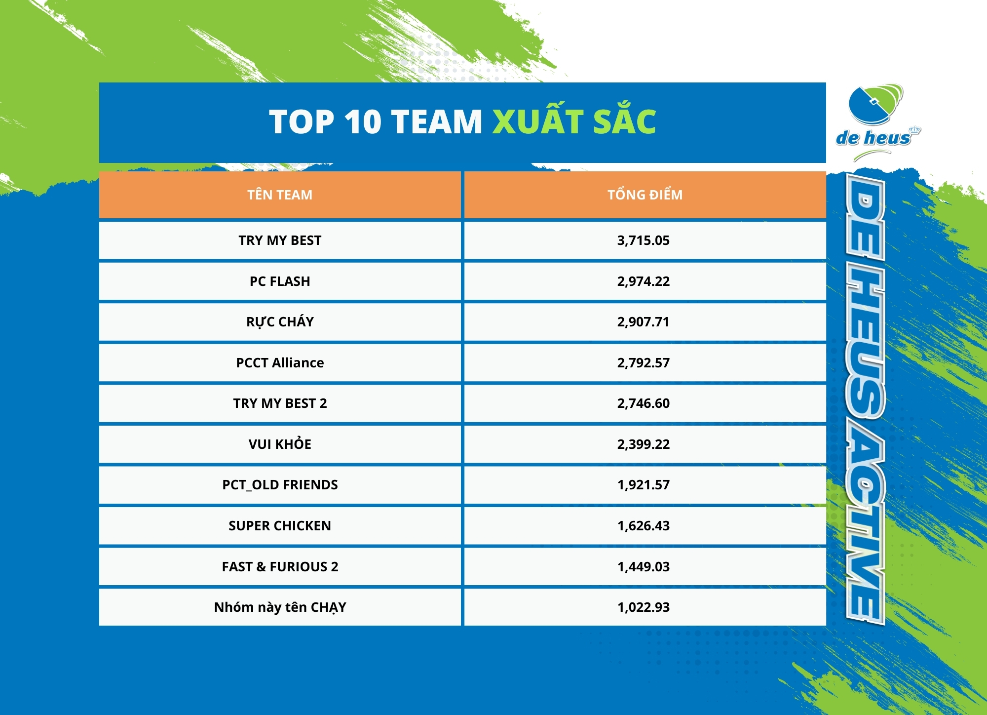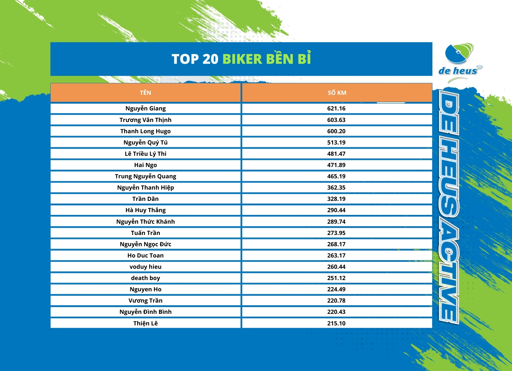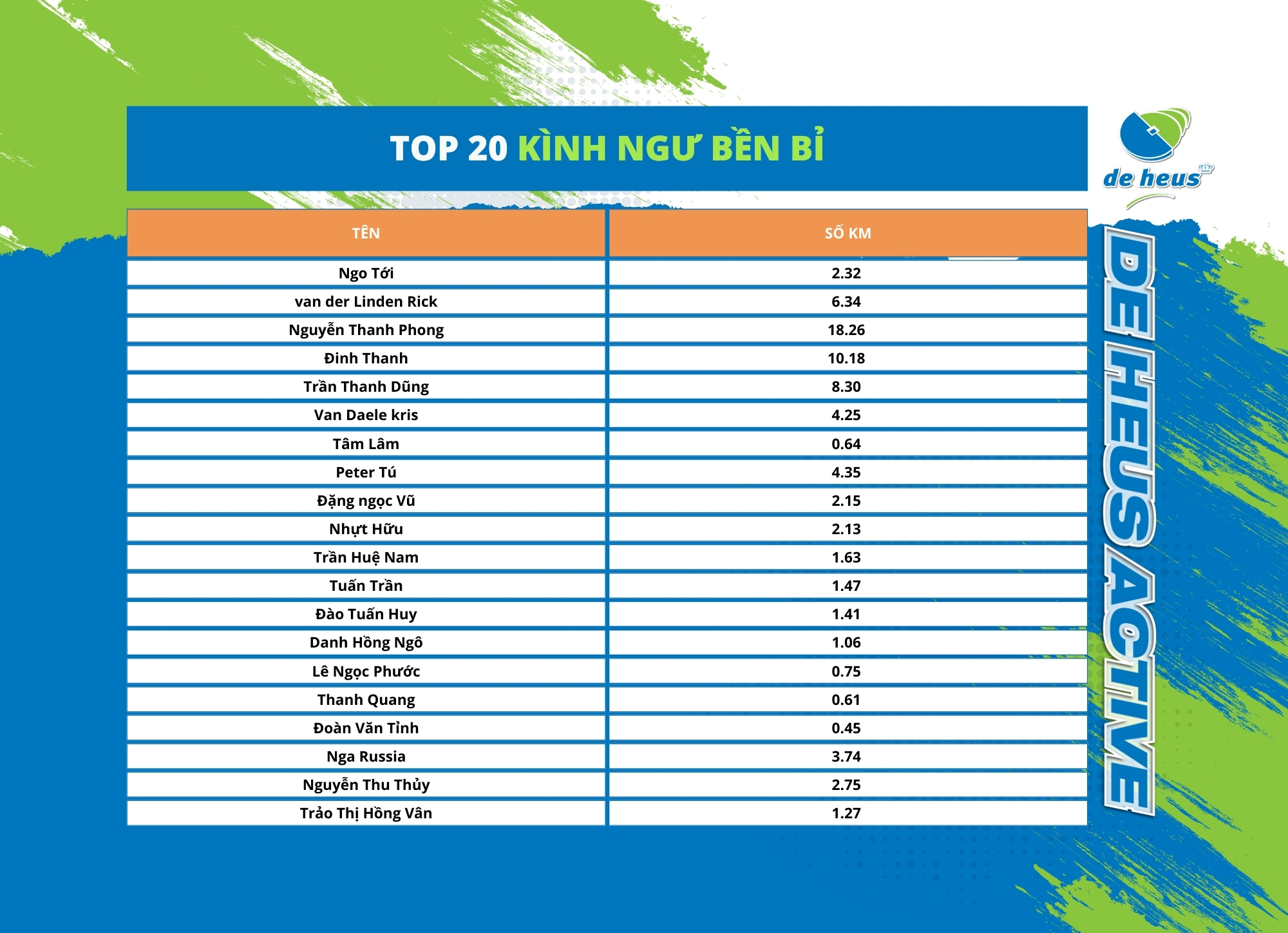 De Heus Active 2024 chân thành cảm ơn sự đón nhận và tham gia tích cực của 810 nhân viên ở khắp 58 tỉnh thành. Tinh thần thể thao nhiệt huyết của những “vận động viên” De Heus xuyên suốt 23 ngày đã được thể hiện qua các con số 78.407 km, 11.652 hoạt động đầy ấn tượng.