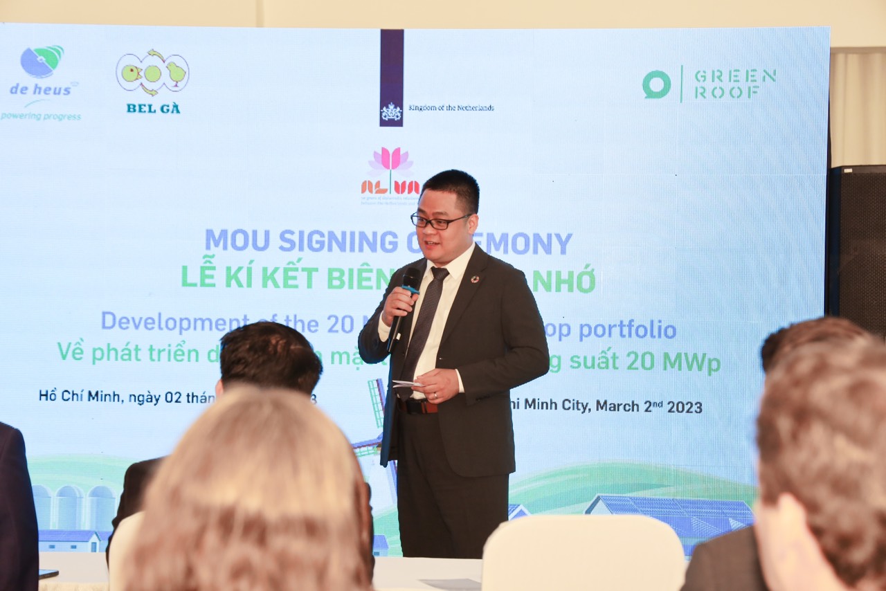 Vào 02/03/2023, De Heus, Bel Gà và Green Roof đã cùng kí kết Biên bản Ghi nhớ đánh dấu sự hợp tác để cùng phát triển dự án điện mặt trời áp mái với công suất lên đến 20 MWp cho De Heus và Bel Gà tại 19 tỉnh thành trên khắp Việt Nam trong hai năm sắp tới.
