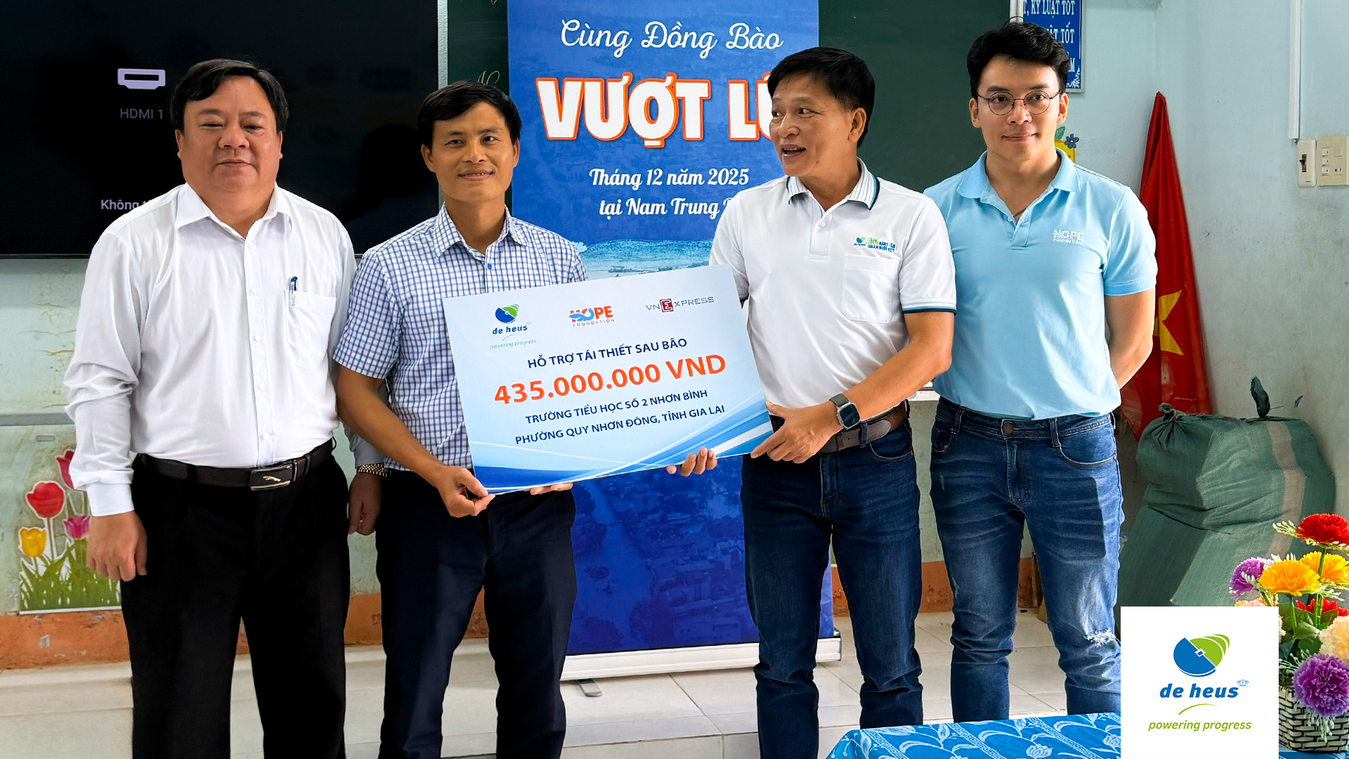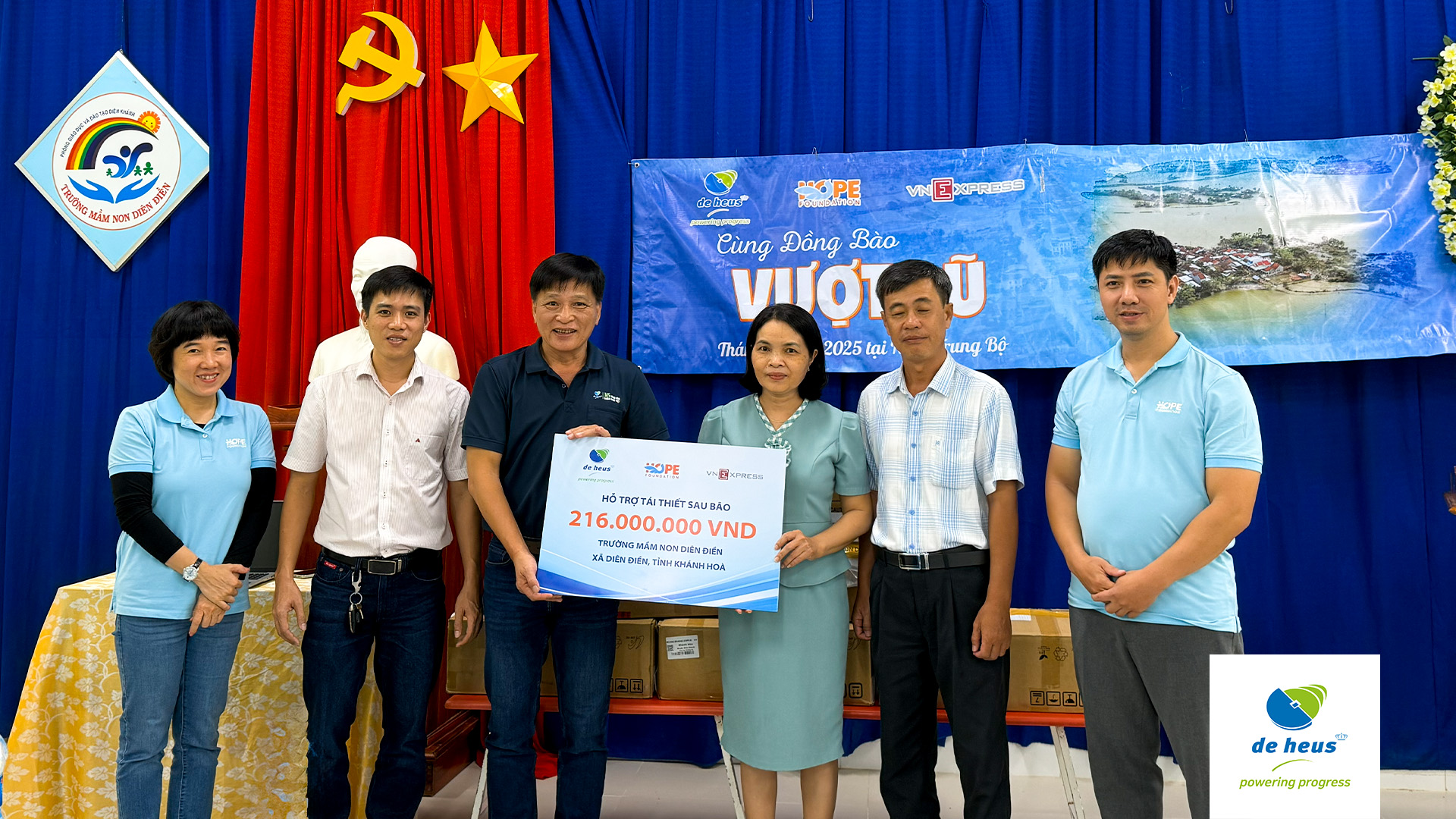 Tiếp nối hoạt động này, trong chương trình “Cùng đồng bào vượt lũ”, De Heus Việt Nam tiếp tục hỗ trợ 1,8 tỷ đồng nhằm tái thiết 8 trường học tại Gia Lai, Đắk Lắk và Khánh Hòa. Nguồn hỗ trợ được sử dụng để sửa chữa phòng học, mái trường, tường rào và nhà vệ sinh; khắc phục các hư hỏng do ngập lụt; đồng thời bổ sung trang thiết bị dạy học và đồ dùng học tập. Bên cạnh đó, De Heus Việt Nam còn trao tặng 16.000 cuốn vở cho học sinh tại các địa phương này, góp phần giúp các em sớm ổn định việc học.