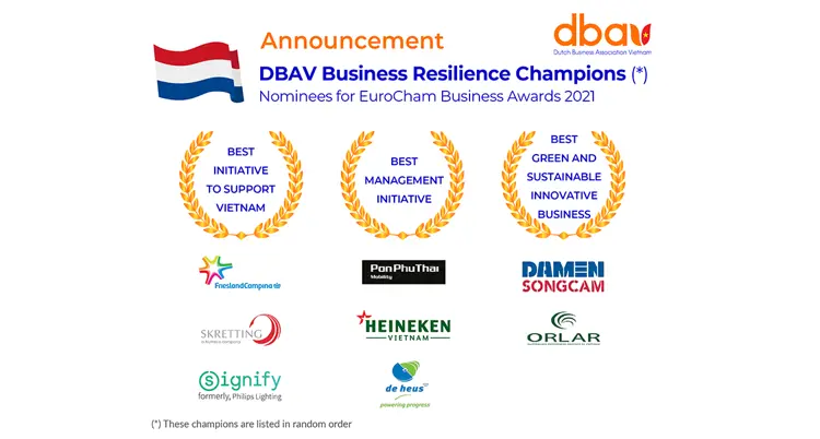 Thứ Năm, ngày 18 tháng 11, Hiệp hội Doanh nghiệp Hà Lan Việt Nam (DBAV) vui mừng thông báo những doanh nghiệp chiến thắng giải thưởng “ Business Resilience Awards ”. Giải thưởng này có 2 hạng mục nhằm vinh danh các công ty Hà Lan đã thể hiện trách nhiệm xã hội của họ trong suốt thời gian đại dịch Covid-19 bùng phát ở Việt Nam và một hạng mục về doanh nghiệp xanh và bền vững. De Heus tự hào là một trong những doanh nghiệp được vinh danh trong hạng mục “Doanh nghiệp có sáng kiến quản lý tốt nhất để hỗ trợ công nhân viên và gia đình của họ”