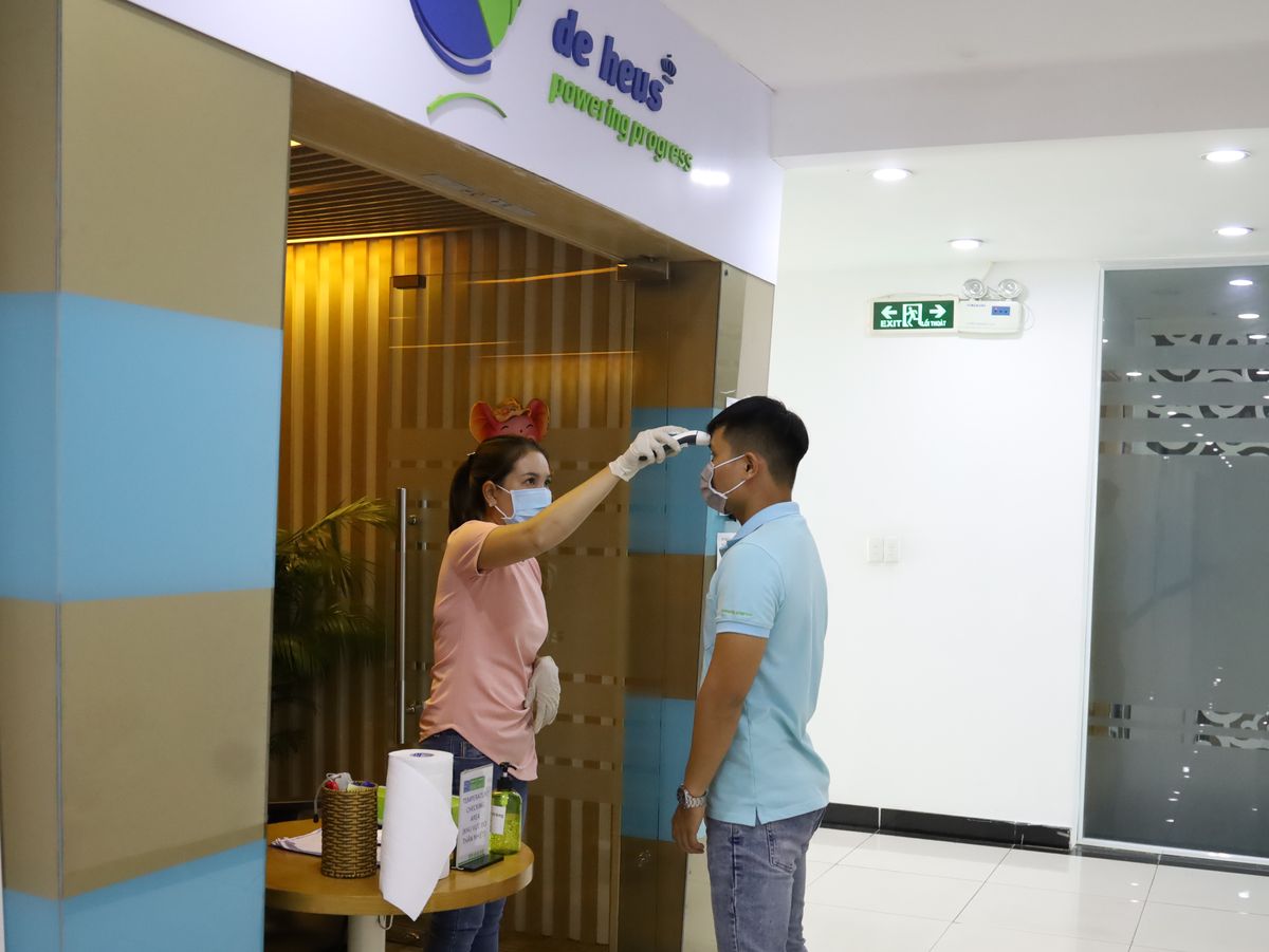 Cụ thể thời gian vừa qua, tại văn phòng De Heus Việt Nam cũng đã có những biện pháp cụ thể chủ động phòng chống dịch Covid-19 tại nơi làm việc như: bố trí nhân lực tại cổng ra vào vào đầu giờ làm việc để đo thân nhiệt nhanh cho nhân viên, thường xuyên tiến hành phun khử khuẩn khu vực văn phòng; hạn chế tổ chức các cuộc họp, hội nghị, các hoạt động tập trung đông người trừ trường hợp thực sự cần thiết; có cơ chế cho phép nhân viên làm việc tại nhà hoặc bố trí ca làm việc linh hoạt (nếu được); khuyến khích người lao động trao đổi, làm việc trực tuyến qua điện thoại, Email,... Ngoài ra còn bố trí đầy đủ các bình rửa tay khô xung quanh văn phòng cũng như khu vực tiếp tân đảm bảo cho cả nhân viên cũng như khách ghé thăm văn phòng.