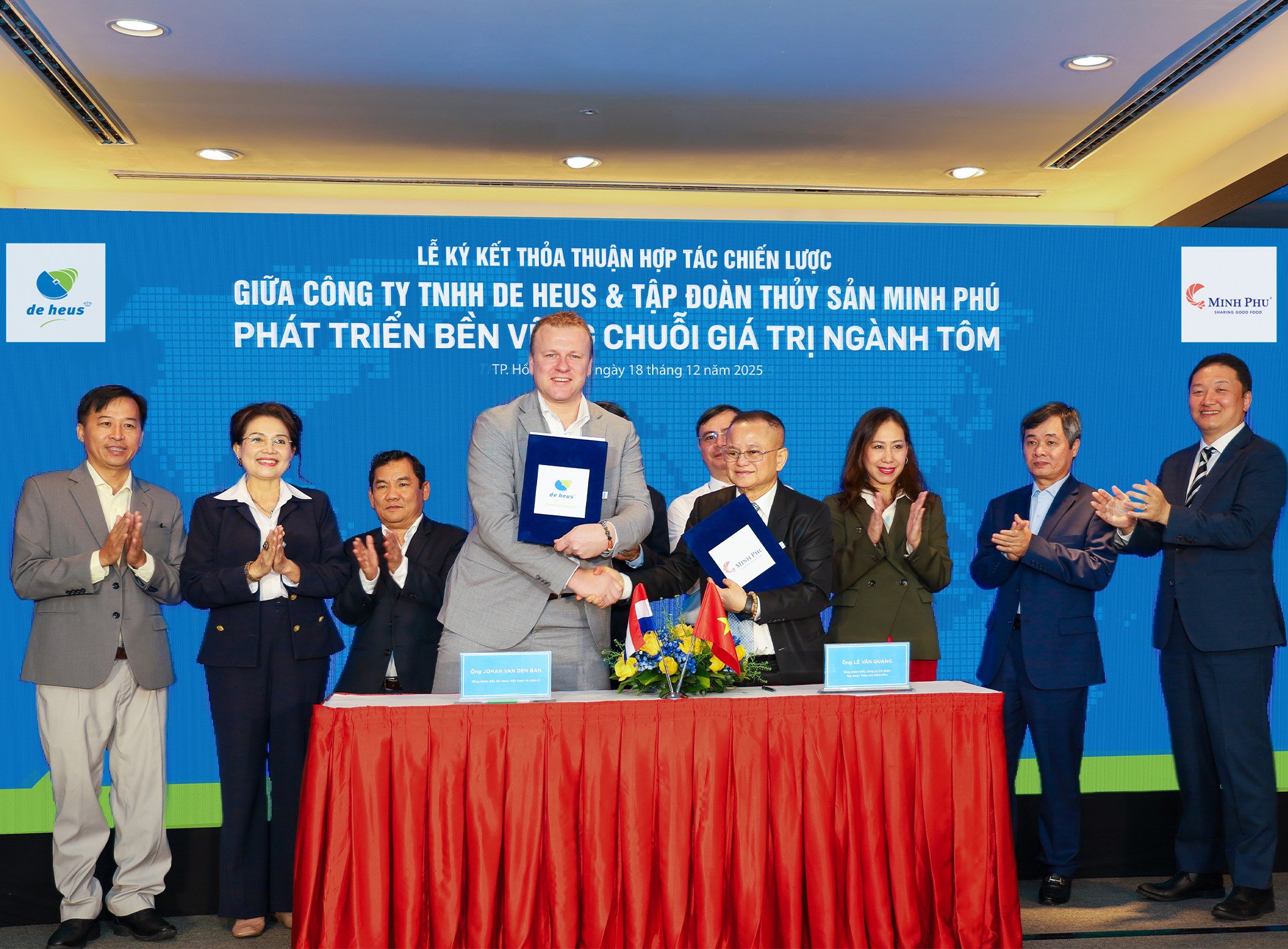 Phát biểu tại buổi ký kết thỏa thuận hợp tác, ông Johan van den Ban, Tổng Giám đốc De Heus Việt Nam và châu Á, chia sẻ: “Chúng tôi rất vui mừng khi hợp tác cùng Minh Phú - doanh nghiệp hàng đầu trong lĩnh vực nuôi trồng và chế biến thủy sản tại Việt Nam. Sự kết hợp giữa thế mạnh về dinh dưỡng và giải pháp kỹ thuật của De Heus với kinh nghiệm, quy mô và năng lực chế biến -xuất khẩu của Minh Phú sẽ tạo nên một chuỗi giá trị bền vững cho ngành tôm, từ thức ăn, kỹ thuật nuôi đến chế biến và kết nối thị trường quốc tế. Đây sẽ là động lực quan trọng để phát triển bền vững, gia tăng giá trị và sức cạnh tranh của ngành tôm Việt Nam, chinh phục các thị trường khó tính.”