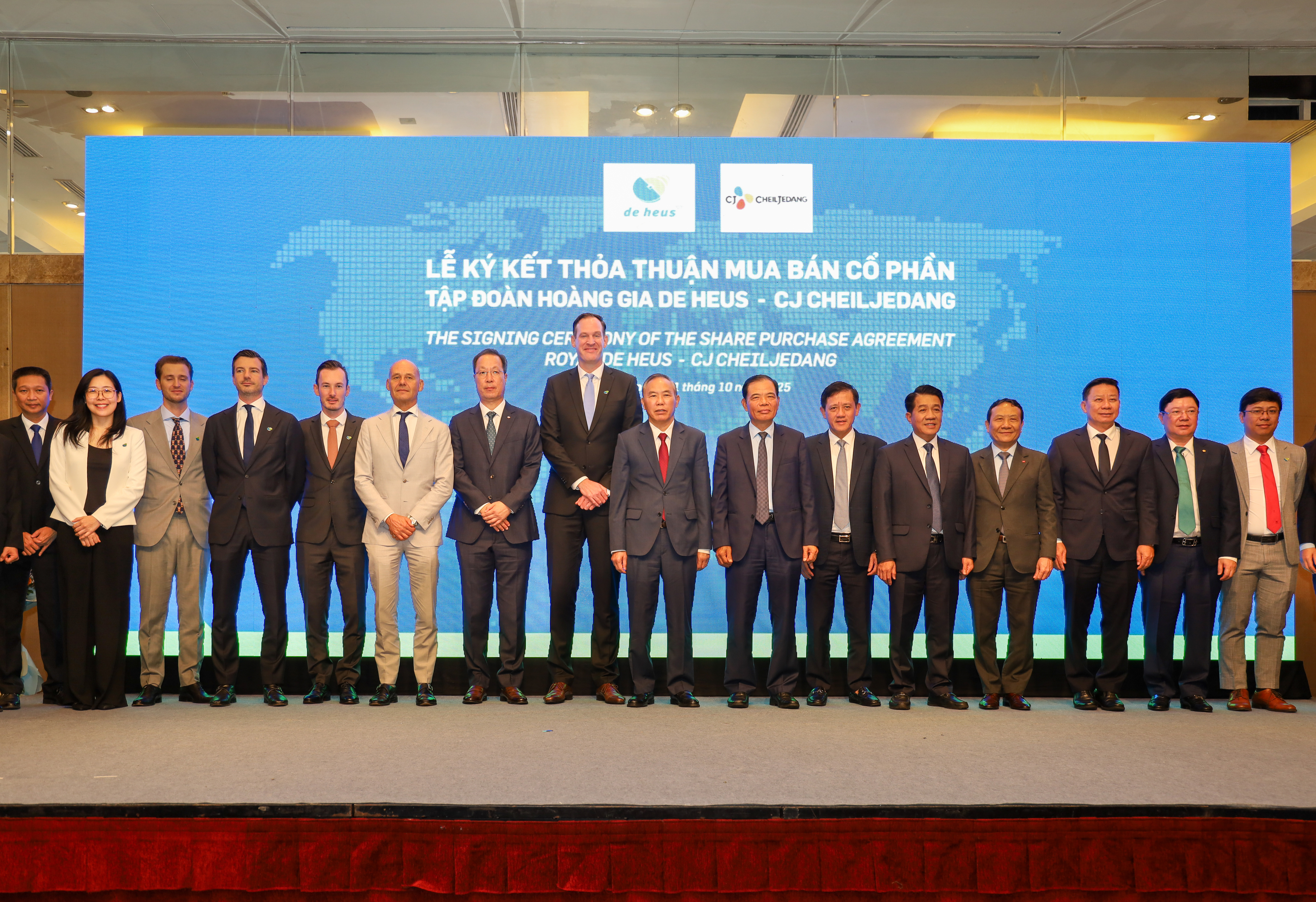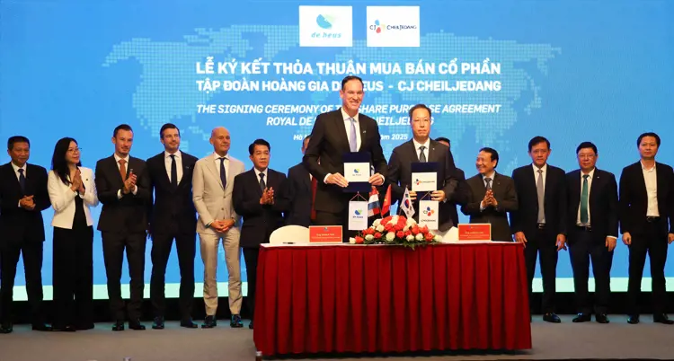 Ngày 01 tháng 10 năm 2025, tại Hà Nội, Tập đoàn Hoàng gia De Heus đã ký kết Thỏa thuận Mua lại 100% Cổ phần của Tập đoàn CJ Feed & Care, theo đó De Heus sẽ tiếp quản toàn bộ hoạt động kinh doanh của CJ Feed & Care tại Việt Nam, Indonesia, Hàn Quốc, Campuchia và Philippines. Thương vụ này đánh dấu một bước tiến quan trọng trong chiến lược tăng trưởng dài hạn của De Heus, thể hiện rõ tham vọng không ngừng của Tập đoàn trong việc mang đến nguồn thực phẩm an toàn, lành mạnh và giá cả hợp lý thông qua việc hỗ trợ các hộ chăn nuôi và nuôi trồng thủy sản độc lập tại các thị trường tăng trưởng trọng điểm. Thương vụ bao gồm 17 nhà máy sản xuất thức ăn chăn nuôi.