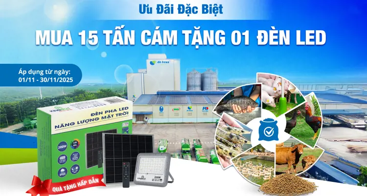- Mua 15 tấn thức ăn chăn nuôi tặng 01 Đèn pha LED sử dụng năng lượng mặt trời.